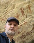 Painel com arte rupestre, destaque para uma pintura que tem o formato de um avião, daí o...