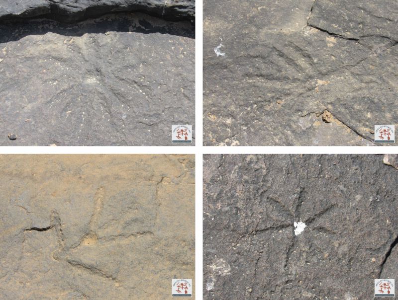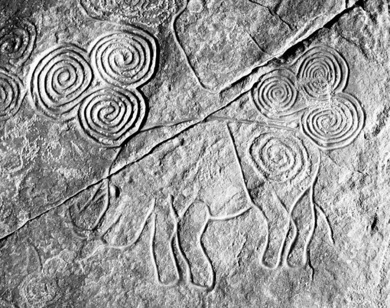 Uma outra ocorrência de espiral tripla vem da Argélia, no continente africano. Desta vez, são duas gravuras bem próximas, tendo um zoomorfo (que lembra um elefante) ao centro (Figura 4).
