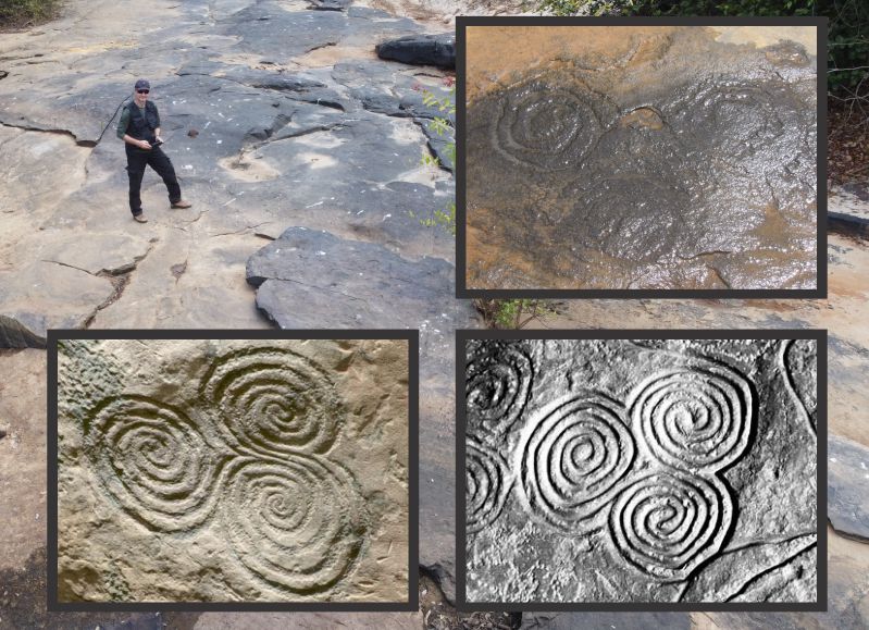 Aqui neste texto, destacarei uma gravura com uma espiral tripla, existente no leito do Rio Pirangi, na localidade Branquinhas. Figuras 1 e 2.