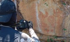 Painel com várias pinturas rupestres a maioria graúdas em formas de cruzes preenchidas e bordadas, geométricas, zoomorfos, abstrações e muitos soliformes. Faz parte da Trilha Caminhos de Caxingó. Visita em outubro de 2025. Imagens: Mais Sítios Arqueológicos